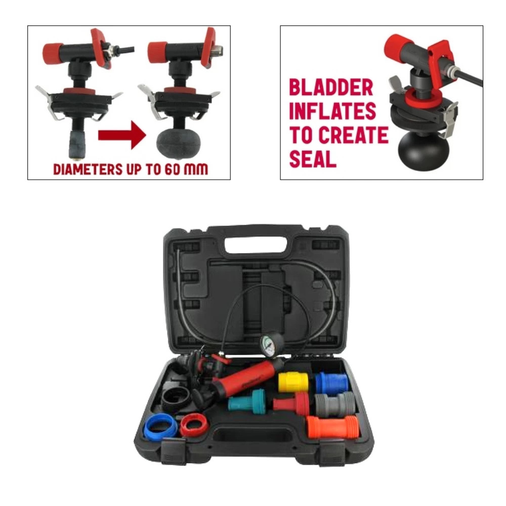 A táskában található kétvégű szines adapterek segítségével könnyedén ellenőrizni tudjuk a legtöbb gépjárműiparban használatos hűtőrendszer lezárósapkákat is az előző módszer használatával.