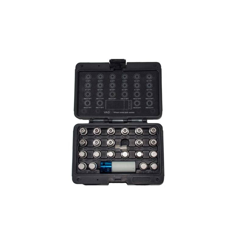 Kerékanya/kerékőr leszedő készlet VAG (Volkswagen, Audi, Skoda, Seat) járművekhez. 23 darabos kiszerelésben erős SCM 440-es acélszerszám