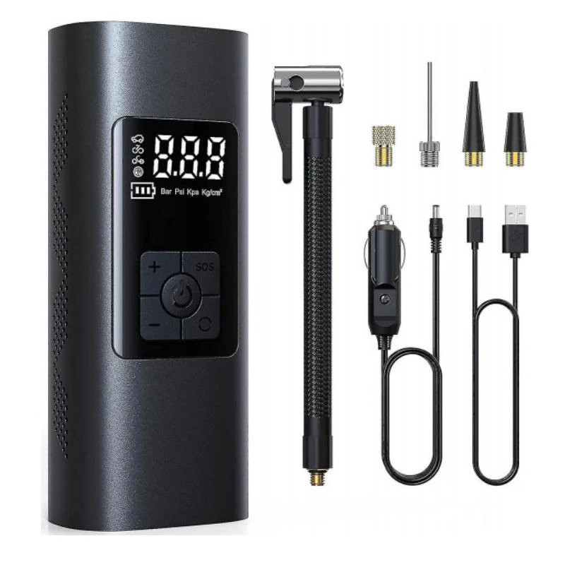 A csomag tartalmazza a pumpatömlőt, különböző adaptereket a sokoldalú felhasználáshoz, USB töltőkábelt, szivargyújtós töltőkábelt, valamint egy praktikus tárolótáskát.