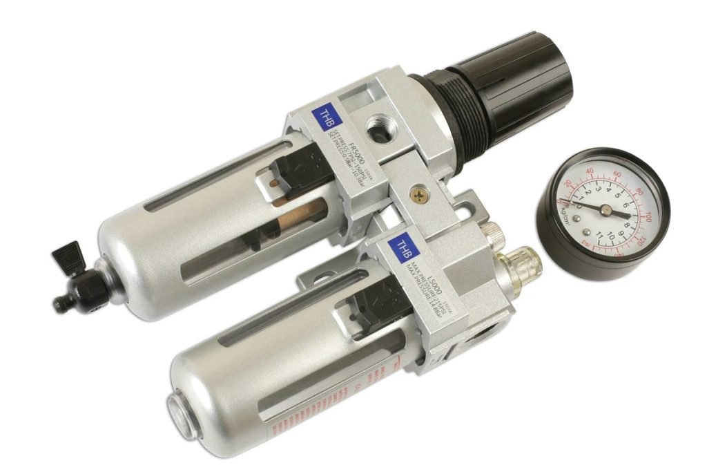 Professzionális minőségű falra szerelhető levegő előkészítő egység.