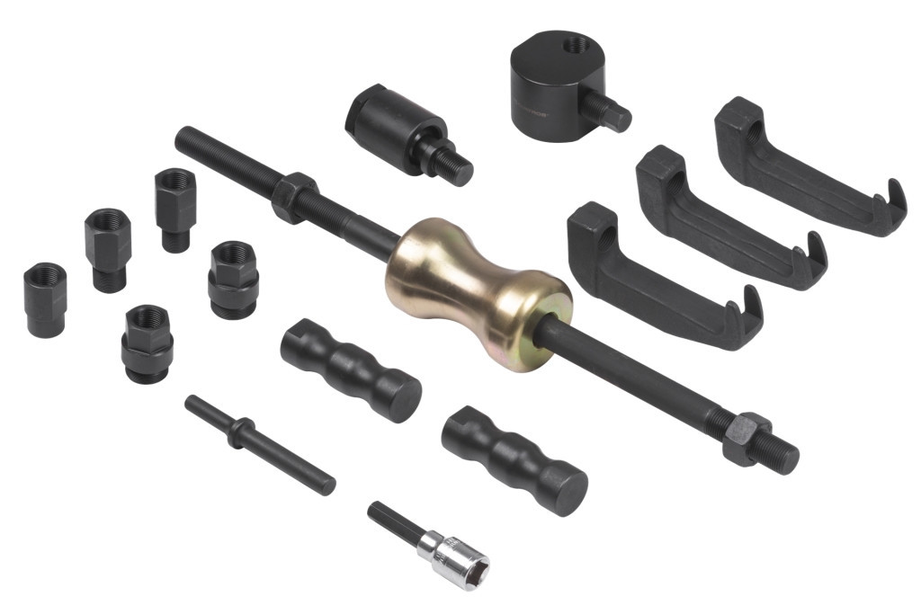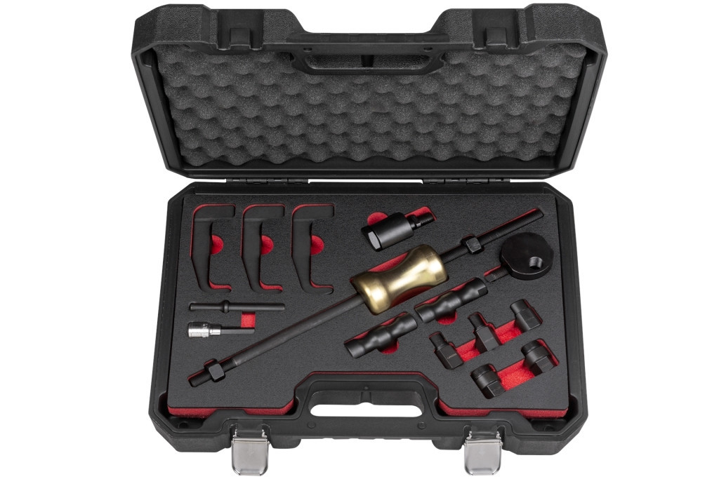 Ez a professzionális injektor kihúzó készlet lehetővé teszi a befecskendező szelepek gyors, precíz és roncsolásmentes eltávolítását még erősen beragadt vagy szennyezett állapotban is. A készlet egy masszív csúszókalapácsos lehúzót is tartalmaz, amellyel a legtöbb piacon elérhető dízel injektor típus eltávolítása megoldható, emellett a készlet használható ütvecsavarozóval is (nem tartozék), így még nagyobb erőhatás kifejtését is lehetővé teszi extrém esetekben.