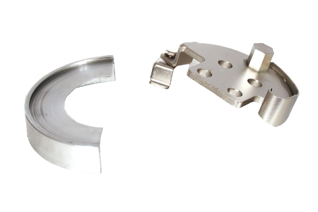 Speciálisan kialakított, acél, és aluminiumfeszítőszíj rögzítő készlet, melyek segítségével gyorsan és biztonságosan szerelhető az elasztikus szíjak egy része.