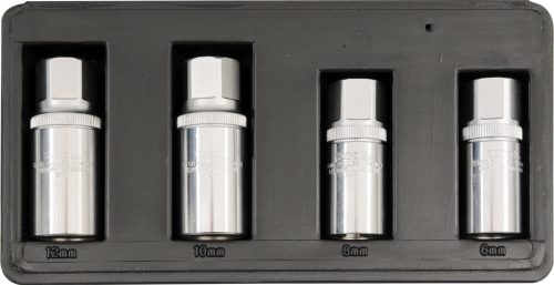 4 részes tőcsavar kiszedő készlet, amely különböző méretű (6, 8, 10, 12 mm) csavarokhoz használható. Strapabíró króm–vanádium acélból készült, 1/2” hajtással és 21 mm-es kulcsnyílással. Kompakt műanyag tokban érkezik, ideális autószerelőknek és műhelyeknek a tőcsavarok menetkímélő eltávolításához.