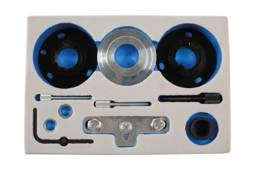 A főtengely szíjtárcsa eltávolításához és cseréjéhez a Laser Tools LAS-7317-es cikkszámú adapterkészlet és a LAS-7318-as cikkszámú nyomatéksokszorzó készlet használata szükséges.