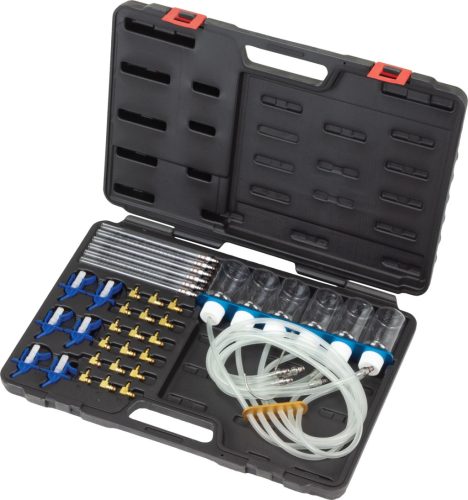6 db üvegcső, 6 db mérőpatron 70 cm-es összekötő vezetékekkel, alumínium rúdra szerelve horgokkal, 24 db adapter Denso C3, C1, Siemens C3, Delphi, Bosch stb.