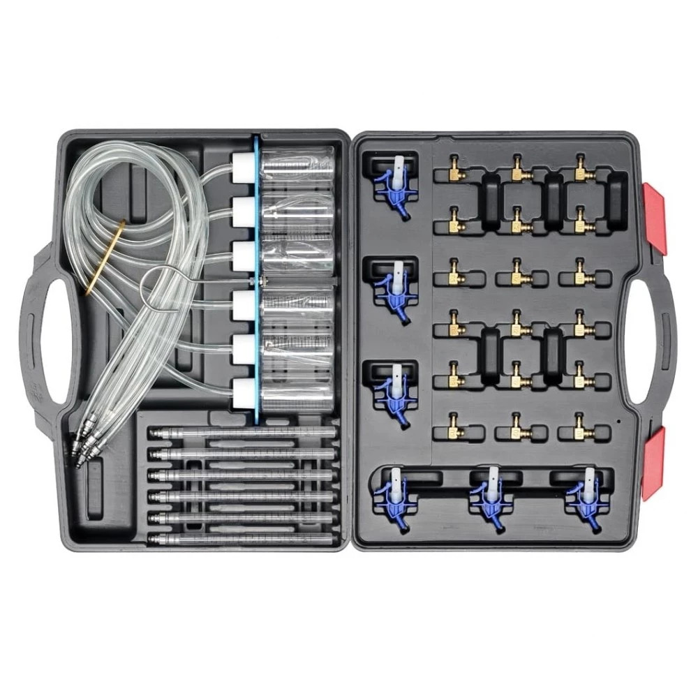6 db üvegcső, 6 db mérőpatron 70 cm-es összekötő vezetékekkel, alumínium rúdra szerelve horgokkal, 24 db adapter Denso C3, C1, Siemens C3, Delphi, Bosch stb.